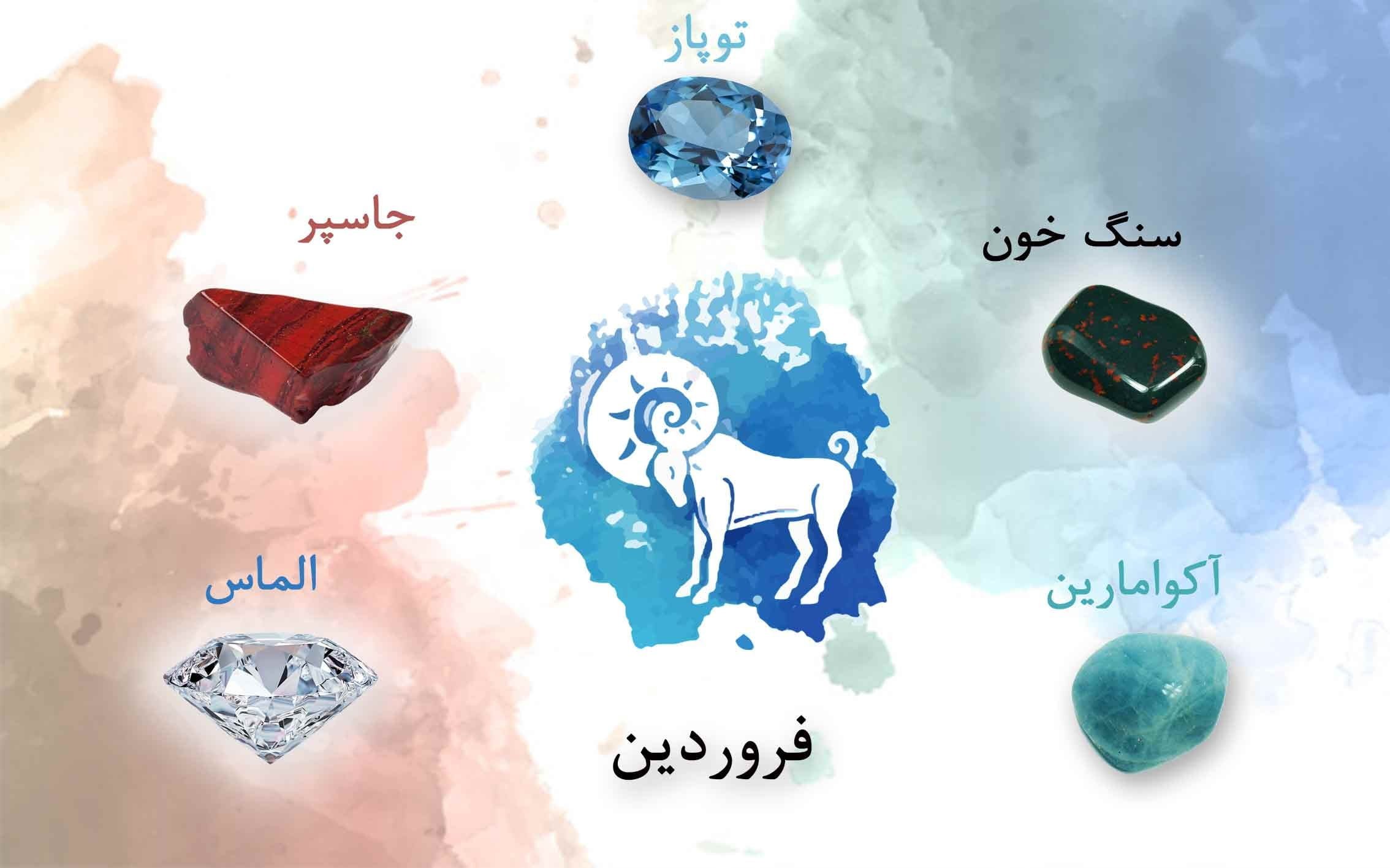 به عنوان یکی از مهمترین سنگهای قیمتی، الماس خصوصیات بسیاری دارد که از جمله زیبایی، شفافیت، سختی و مقاومت در برابر خراشیدگی است. سنگ خون نیز به عنوان یکی از سنگهای قدیمی و باستانی شناخته شده است و خواصی مانند افزایش انرژی و تقویت قلب را دارد. جاسپر نیز به عنوان سنگی با رنگها و الگوهای متنوع شناخته شده است و خواصی مانند افزایش اعتماد به نفس و تقویت اراده را دارد. توپاز زرد نیز به عنوان سنگی با رنگ زرد شناخته شده است و خواصی مانند افزایش خلاقیت و تمرکز را دارد. آکومارین به عنوان سنگی با رنگ آبی شناخته شده است و خواصی مانند افزایش صلابت و اعتماد به نفس را دارد. یاقوت کبود نیز به عنوان سنگی با رنگ آبی تیره شناخته شده است و خواصی مانند افزایش انرژی و تقویت قدرت بیان را دارد. در نهایت، خصوصیات رفتاری و اخلاقی افراد متولد در ماه فروردین شامل صداقت، مسئولیتپذیری، قدرت تصمیمگیری، انعطافپذیری و احترام به دیگران میباشد.