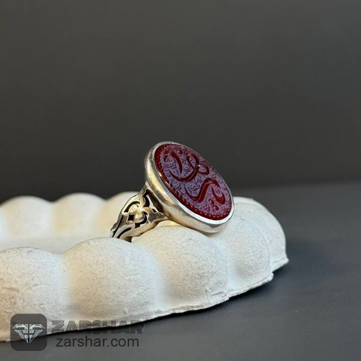رکاب نقرهای این انگشتر با عیار ۹۲۵، با ظرافت تمام طراحی شده و نگین نفیس عقیق سرخ خراسانی را در بر گرفته است. خط “یا زهرا (س)” با خطاطی درجه یک بر روی نگین نقش بسته و جلوهای معنوی به آن بخشیده است. این انگشتر، حاصل هنر دست استادکاران ماهر زرشار است و با دقت و وسواس فراوان ساخته شده تا شما لایق بهترینها باشید.