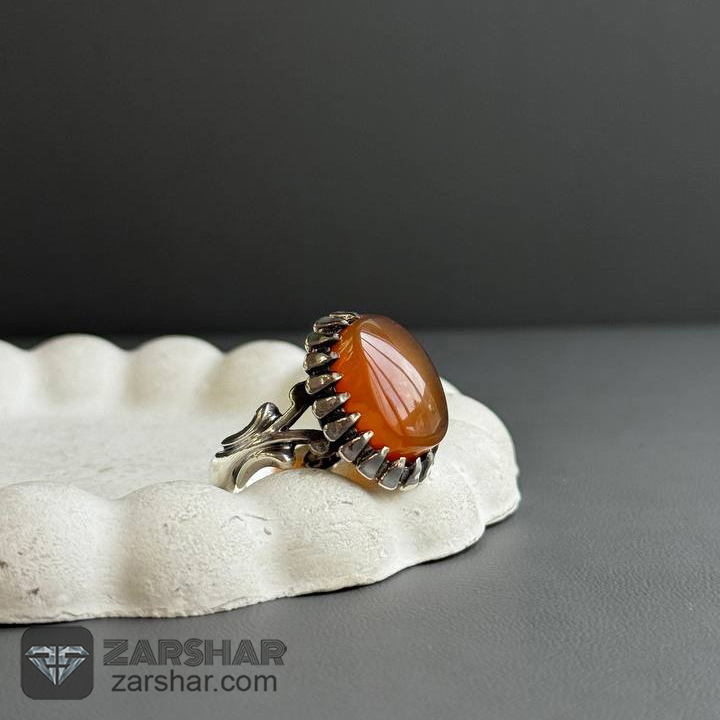 درخشش گرم و دلنشین عقیق پرتقالی یمنی، این انگشتر نفیس را به جواهری بینظیر تبدیل کرده است. انگشتری که نه تنها زیبایی دستان شما را دوچندان میکند، بلکه آرامش و انرژی مثبت را نیز به همراه دارد. نقره با عیار ۹۲۵، با ظرافت و دقت تمام، قاب این نگین آتشین شده تا اصالت و شکوه آن را به رخ بکشد.