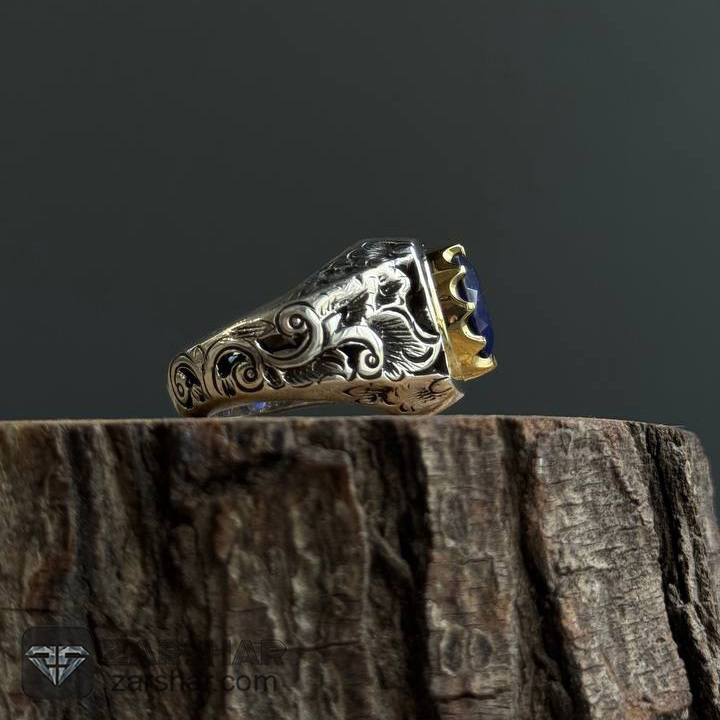 درخشش یاقوت کبود آفریقایی، با تراشی دلفریب و رنگی آسمانی، در کنار هنر دست استادکاران قلمزن، این انگشتر را به اثری بیبدیل تبدیل کرده است. جواهری که فراتر از یک زیور، حامل انرژی و آرامش است و شکوهی خاص به استایل شما میبخشد.