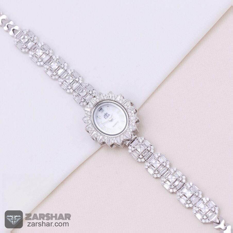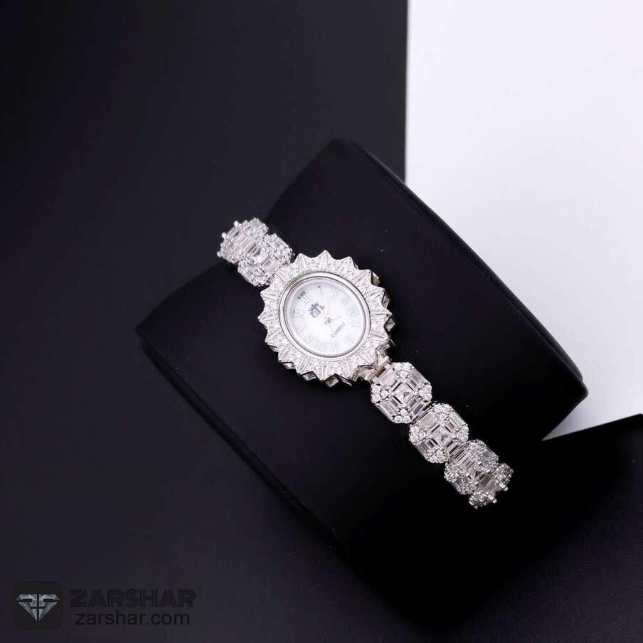 ساعت جواهری رودیوم با نگین های برلیان, کاری بسیار ظریف و زیبا همراه با روکش آب طلای سفید می باشد. عیار این کار همانند تمامی کار های موجود عیار استاندارد 925 می باشد.