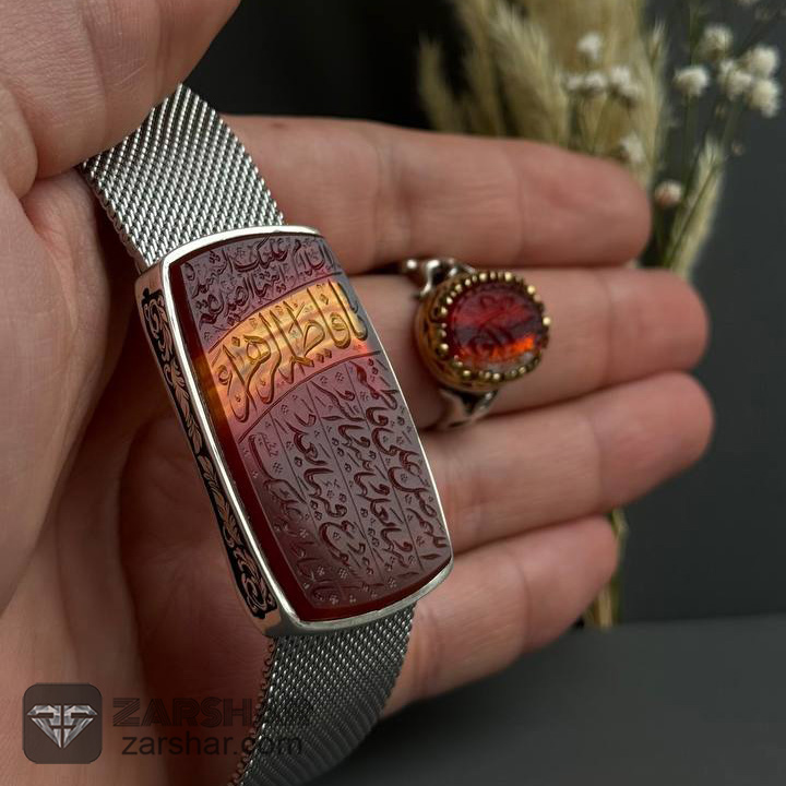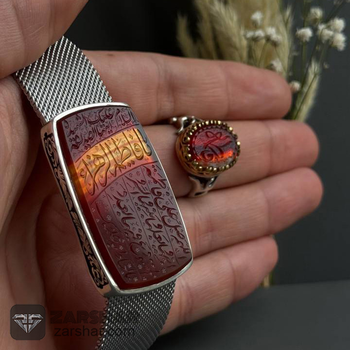 در فرهنگ اسلامی، عقیق جایگاه ویژهای دارد و به عنوان سنگ برکت و افزایش رزق و روزی شناخته میشود. گفته شده است که همراه داشتن عقیق، آرامش و ایمنی را به ارمغان میآورد و انسان را از بلاها حفظ میکند. ذکر صلوات خاصه حضرت زهرا (س) بر روی دستبند و نام مبارک “فاطمه (س)” بر روی انگشتر، این ست را سرشار از نور و معنویت کرده است.